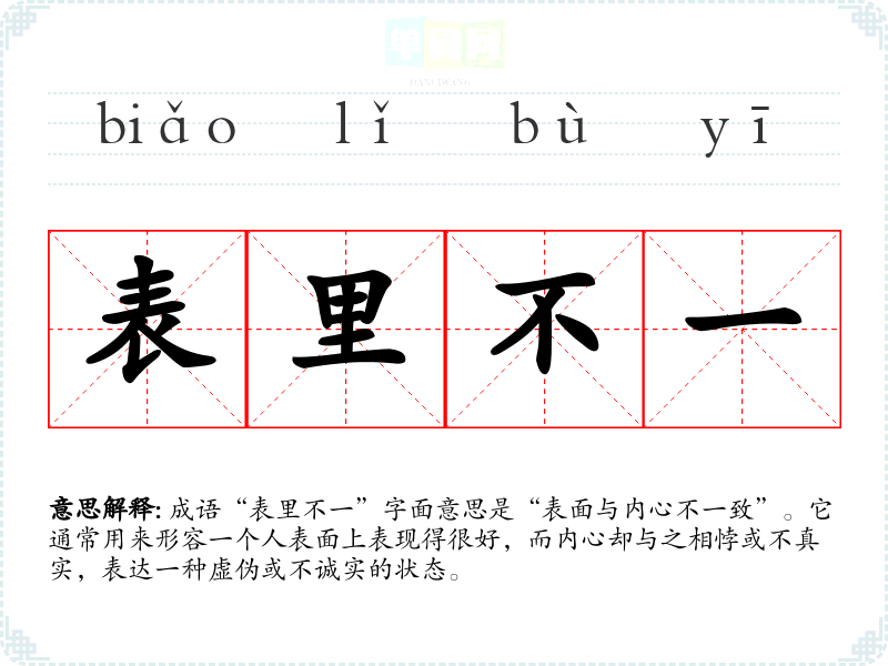 成语“表里不一”字面意思是“表面与内心不一致”。它通常用来形容一个人表面上表现得很好,而内心却与之相悖或不真实,表达一种虚伪或不诚实的状态。