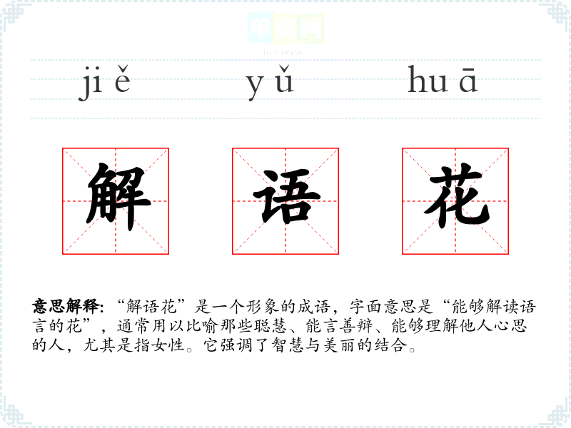 “解语花”是一个形象的成语,字面意思是“能够解读语言的花”,通常用以比喻那些聪慧、能言善辩、能够理解他人心思的人,尤其是指女性。它强调了智慧与美丽的结合。