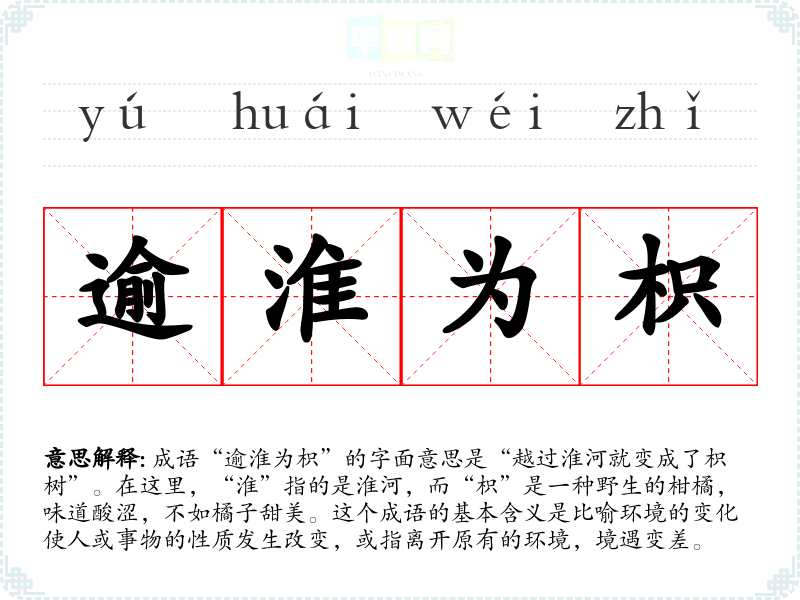成语“逾淮为枳”的字面意思是“越过淮河就变成了枳树”。在这里,“淮”指的是淮河,而“枳”是一种野生的柑橘,味道酸涩,不如橘子甜美。这个成语的基本含义是比喻环境的变化使人或事物的性质发生改变,或指离开原有的环境,境遇变差。