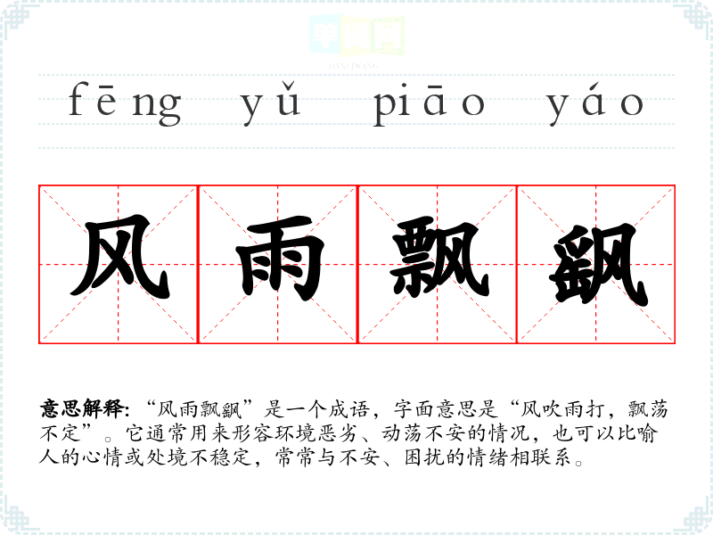 “风雨飘飖”是一个成语,字面意思是“风吹雨打,飘荡不定”。它通常用来形容环境恶劣、动荡不安的情况,也可以比喻人的心情或处境不稳定,常常与不安、困扰的情绪相联系。