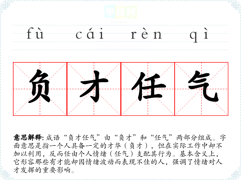 成语“负才任气”由“负才”和“任气”两部分组成。字面意思是指一个人具备一定的才华(负才),但在实际工作中却不加以利用,反而任由个人情绪(任气)支配其行为。基本含义上,它形容那些有才能却因情绪波动而表现不佳的人,强调了情绪对人才发挥的重要影响。