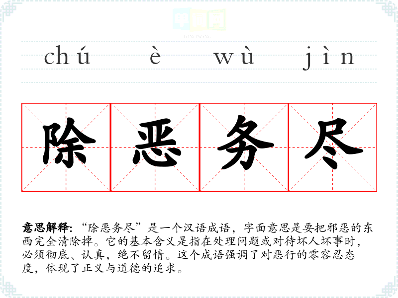 “除恶务尽”是一个汉语成语,字面意思是要把邪恶的东西完全清除掉。它的基本含义是指在处理问题或对待坏人坏事时,必须彻底、认真,绝不留情。这个成语强调了对恶行的零容忍态度,体现了正义与道德的追求。