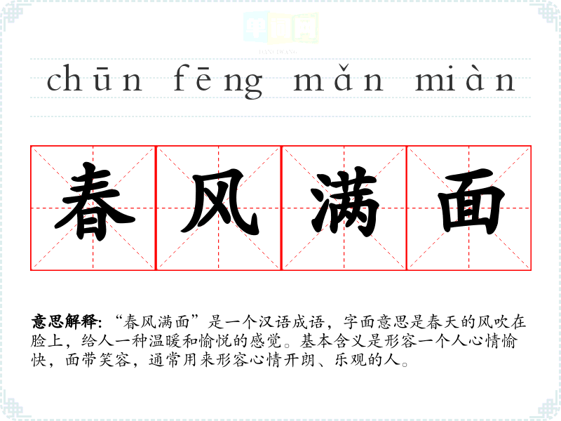 “春风满面”是一个汉语成语,字面意思是春天的风吹在脸上,给人一种温暖和愉悦的感觉。基本含义是形容一个人心情愉快,面带笑容,通常用来形容心情开朗、乐观的人。