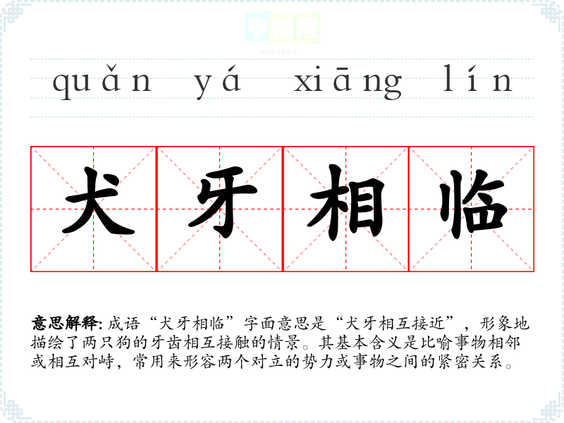成语“犬牙相临”字面意思是“犬牙相互接近”,形象地描绘了两只狗的牙齿相互接触的情景。其基本含义是比喻事物相邻或相互对峙,常用来形容两个对立的势力或事物之间的紧密关系。