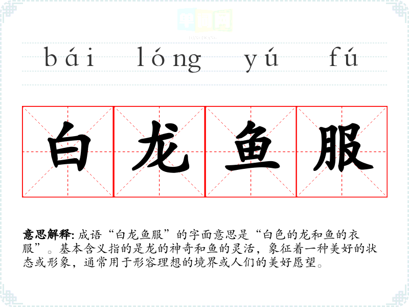 成语“白龙鱼服”的字面意思是“白色的龙和鱼的衣服”。基本含义指的是龙的神奇和鱼的灵活,象征着一种美好的状态或形象,通常用于形容理想的境界或人们的美好愿望。