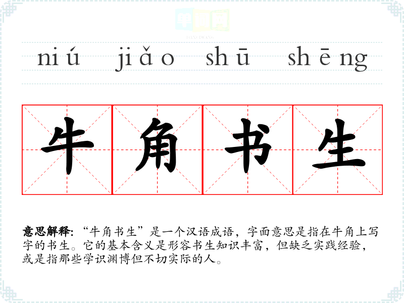 “牛角书生”是一个汉语成语,字面意思是指在牛角上写字的书生。它的基本含义是形容书生知识丰富,但缺乏实践经验,或是指那些学识渊博但不切实际的人。