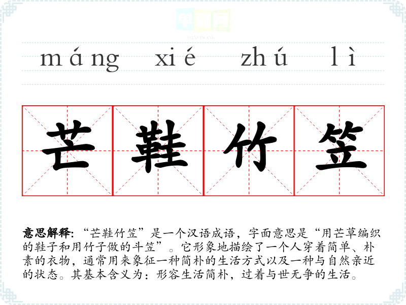 “芒鞋竹笠”是一个汉语成语,字面意思是“用芒草编织的鞋子和用竹子做的斗笠”。它形象地描绘了一个人穿着简单、朴素的衣物,通常用来象征一种简朴的生活方式以及一种与自然亲近的状态。其基本含义为:形容生活简朴,过着与世无争的生活。
