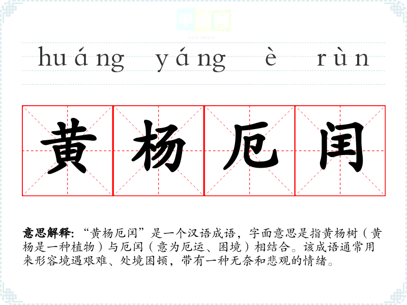 “黄杨厄闰”是一个汉语成语,字面意思是指黄杨树(黄杨是一种植物)与厄闰(意为厄运、困境)相结合。该成语通常用来形容境遇艰难、处境困顿,带有一种无奈和悲观的情绪。