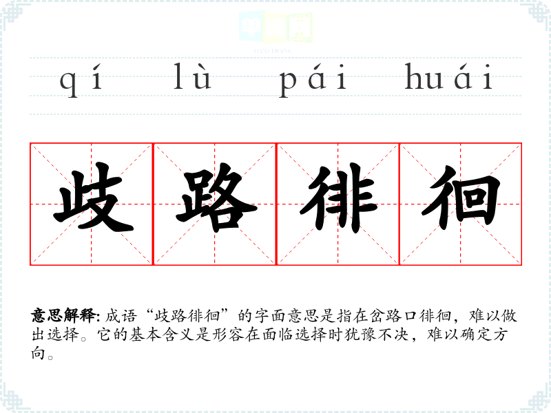 成语“歧路徘徊”的字面意思是指在岔路口徘徊,难以做出选择。它的基本含义是形容在面临选择时犹豫不决,难以确定方向。