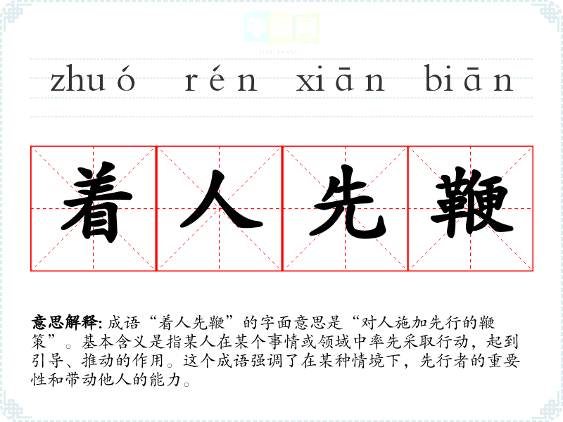 成语“着人先鞭”的字面意思是“对人施加先行的鞭策”。基本含义是指某人在某个事情或领域中率先采取行动,起到引导、推动的作用。这个成语强调了在某种情境下,先行者的重要性和带动他人的能力。