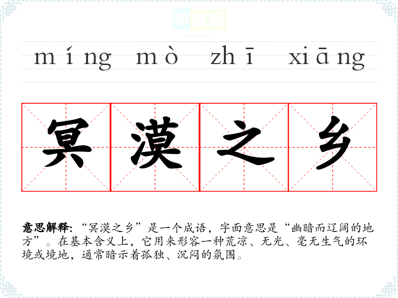 “冥漠之乡”是一个成语,字面意思是“幽暗而辽阔的地方”。在基本含义上,它用来形容一种荒凉、无光、毫无生气的环境或境地,通常暗示着孤独、沉闷的氛围。