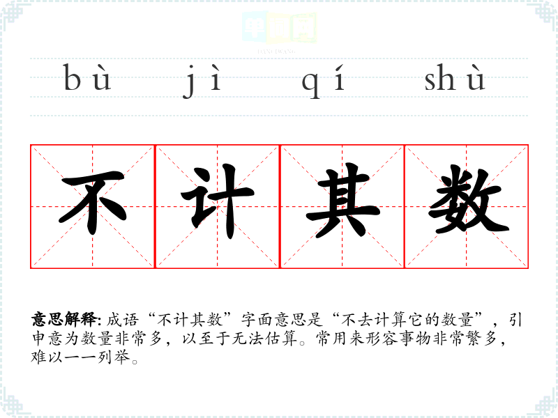 该成语可广泛应用于文学作品、日常对话及演讲等场合。例如,在文学作品中,描述书籍、风景、人物等时,可以用“不计其数”来强调其丰富多样。在日常生活中,当谈及朋友或亲人时,也可以用此成语来形容他们的数量之多。