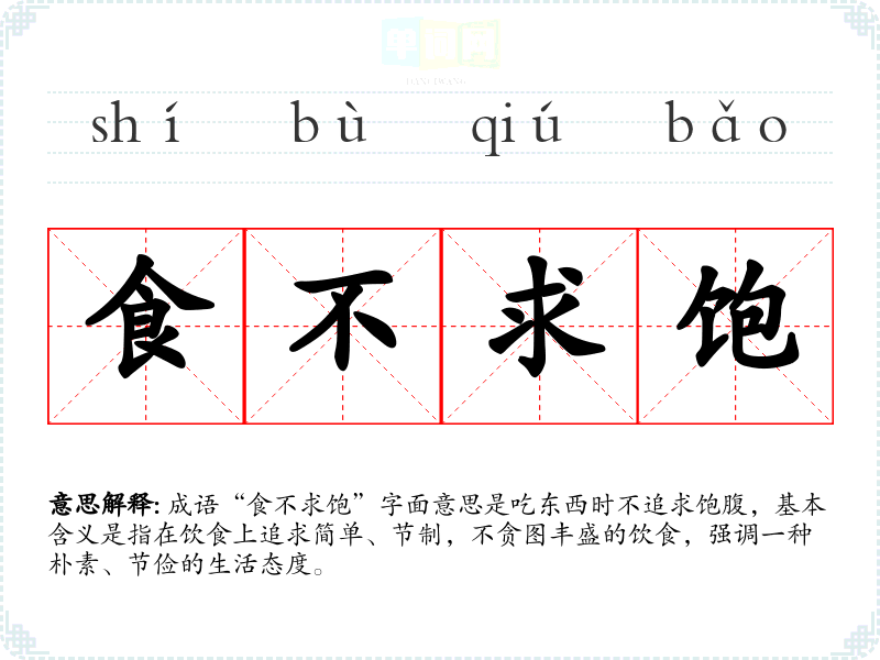 成语“食不求饱”字面意思是吃东西时不追求饱腹,基本含义是指在饮食上追求简单、节制,不贪图丰盛的饮食,强调一种朴素、节俭的生活态度。
