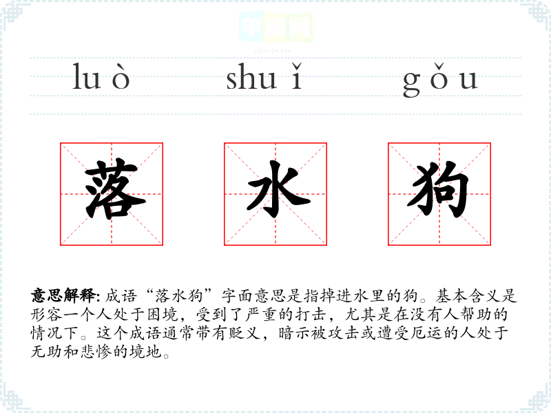 成语“落水狗”字面意思是指掉进水里的狗。基本含义是形容一个人处于困境,受到了严重的打击,尤其是在没有人帮助的情况下。这个成语通常带有贬义,暗示被攻击或遭受厄运的人处于无助和悲惨的境地。