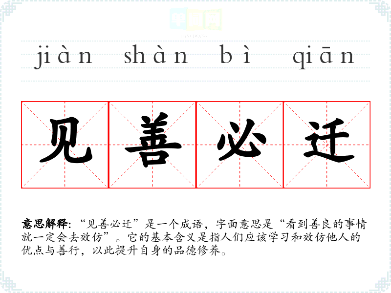 “见善必迁”是一个成语,字面意思是“看到善良的事情就一定会去效仿”。它的基本含义是指人们应该学*和效仿他人的优点与善行,以此提升自身的品德修养。