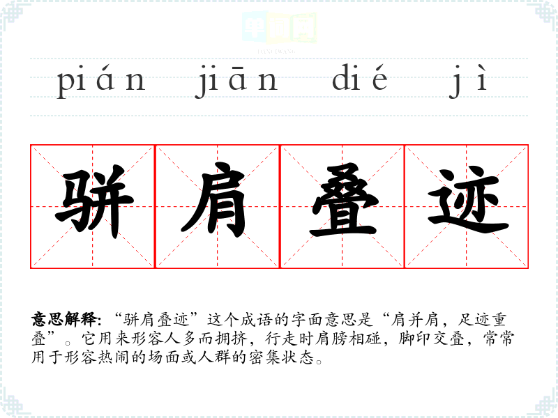 “骈肩叠迹”这个成语的字面意思是“肩并肩,足迹重叠”。它用来形容人多而拥挤,行走时肩膀相碰,脚印交叠,常常用于形容热闹的场面或人群的密集状态。