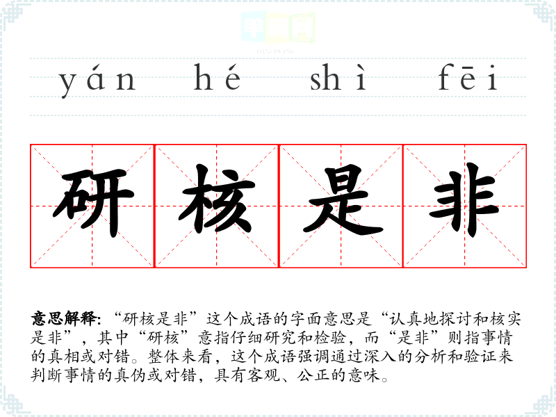 | 研核是非 | 核:对照,考核。研究考核什么是对,什么是错。 |