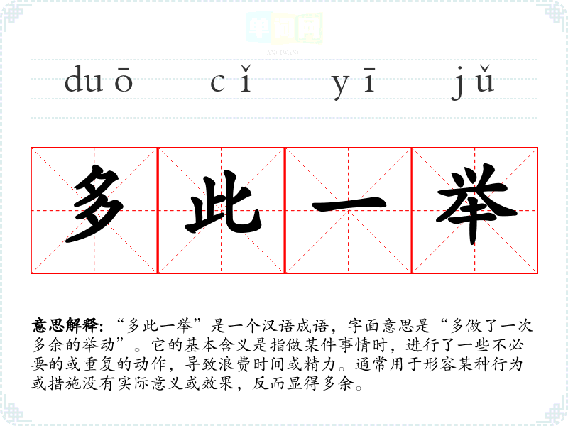 “多此一举”是一个汉语成语,字面意思是“多做了一次多余的举动”。它的基本含义是指做某件事情时,进行了一些不必要的或重复的动作,导致浪费时间或精力。通常用于形容某种行为或措施没有实际意义或效果,反而显得多余。