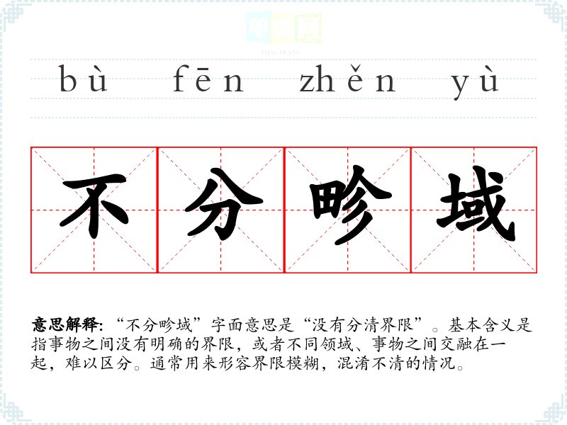 “不分畛域”字面意思是“没有分清界限”。基本含义是指事物之间没有明确的界限,或者不同领域、事物之间交融在一起,难以区分。通常用来形容界限模糊,混淆不清的情况。