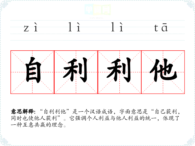 “自利利他”是一个汉语成语,字面意思是“自己获利,同时也使他人获利”。它强调个人利益与他人利益的统一,体现了一种互惠共赢的理念。