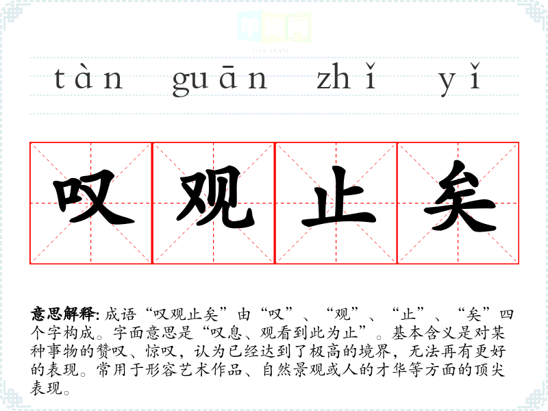 成语“叹观止矣”由“叹”、“观”、“止”、“矣”四个字构成。字面意思是“叹息、观看到此为止”。基本含义是对某种事物的赞叹、惊叹,认为已经达到了极高的境界,无法再有更好的表现。常用于形容艺术作品、自然景观或人的才华等方面的顶尖表现。