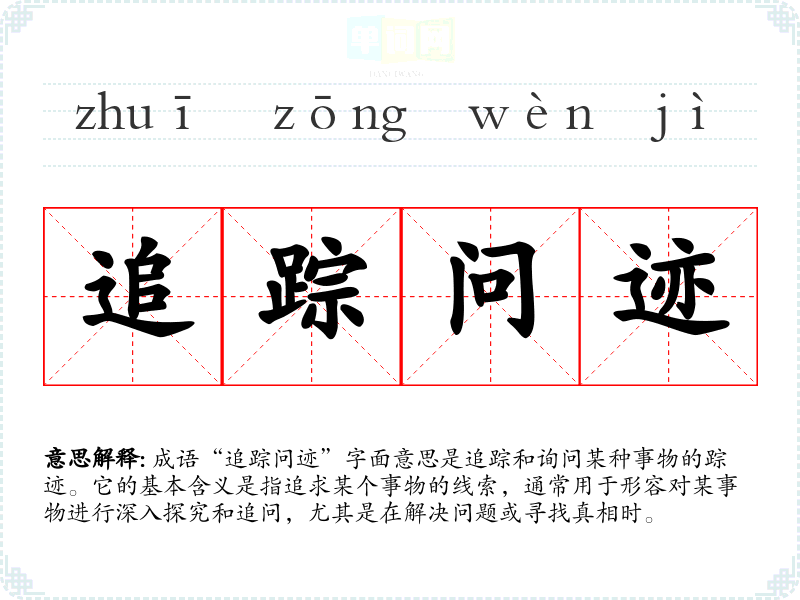 成语“追踪问迹”字面意思是追踪和询问某种事物的踪迹。它的基本含义是指追求某个事物的线索,通常用于形容对某事物进行深入探究和追问,尤其是在解决问题或寻找真相时。