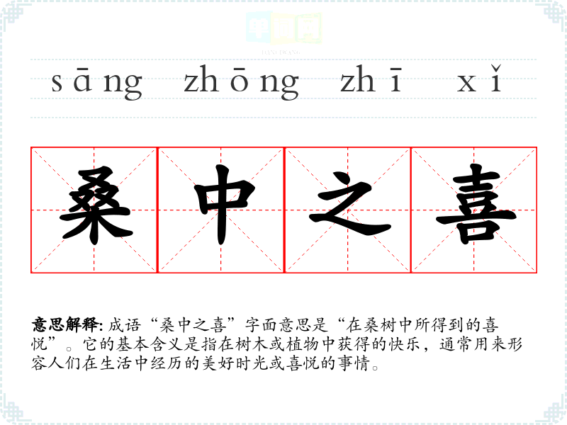 成语“桑中之喜”字面意思是“在桑树中所得到的喜悦”。它的基本含义是指在树木或植物中获得的快乐,通常用来形容人们在生活中经历的美好时光或喜悦的事情。