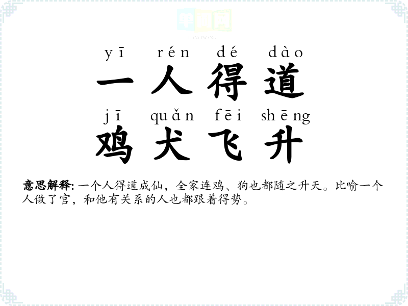 | 一人得道,鸡犬飞升 | 一个人得道成仙,全家连鸡、狗也都随之升天。比喻一个人做了官,和他有关系的人也都跟着得势。 |
