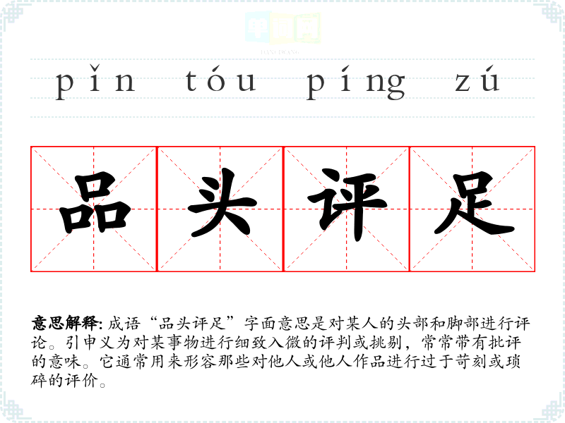 成语“品头评足”字面意思是对某人的头部和脚部进行评论。引申义为对某事物进行细致入微的评判或挑剔,常常带有批评的意味。它通常用来形容那些对他人或他人作品进行过于苛刻或琐碎的评价。