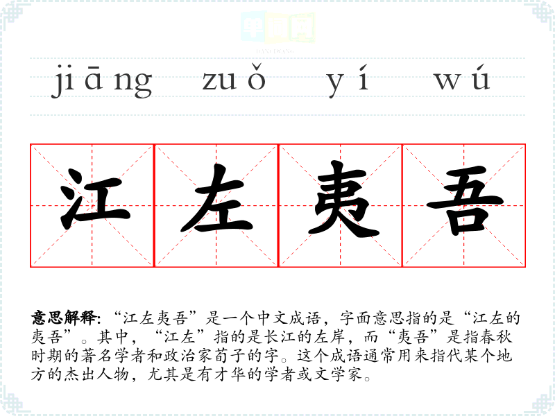 “江左夷吾”是一个中文成语,字面意思指的是“江左的夷吾”。其中,“江左”指的是长江的左岸,而“夷吾”是指春秋时期的著名学者和政治家荀子的字。这个成语通常用来指代某个地方的杰出人物,尤其是有才华的学者或文学家。