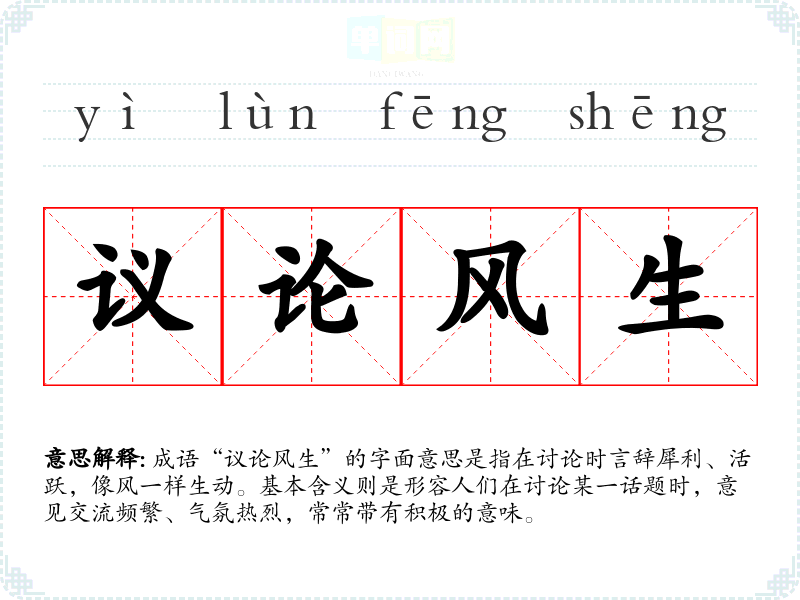 成语“议论风生”的字面意思是指在讨论时言辞犀利、活跃,像风一样生动。基本含义则是形容人们在讨论某一话题时,意见交流频繁、气氛热烈,常常带有积极的意味。