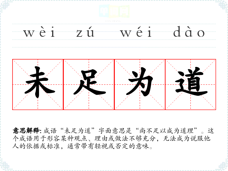 成语“未足为道”字面意思是“尚不足以成为道理”。这个成语用于形容某种观点、理由或做法不够充分,无法成为说服他人的依据或标准,通常带有轻视或否定的意味。