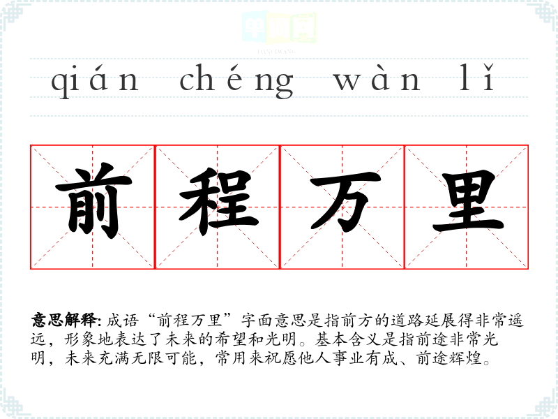 成语“前程万里”字面意思是指前方的道路延展得非常遥远,形象地表达了未来的希望和光明。基本含义是指前途非常光明,未来充满无限可能,常用来祝愿他人事业有成、前途辉煌。