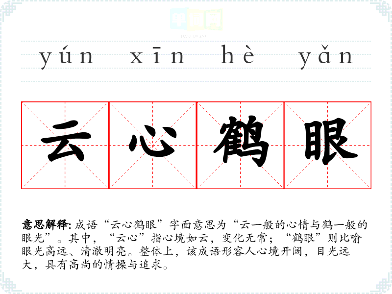 成语“云心鹤眼”字面意思为“云一般的心情与鹤一般的眼光”。其中,“云心”指心境如云,变化无常;“鹤眼”则比喻眼光高远、清澈明亮。整体上,该成语形容人心境开阔,目光远大,具有高尚的情操与追求。