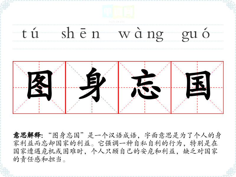 “图身忘国”是一个汉语成语,字面意思是为了个人的身家利益而忘却国家的利益。它强调一种自私自利的行为,特别是在国家遭遇危机或困难时,个人只顾自己的安危和利益,缺乏对国家的责任感和担当。