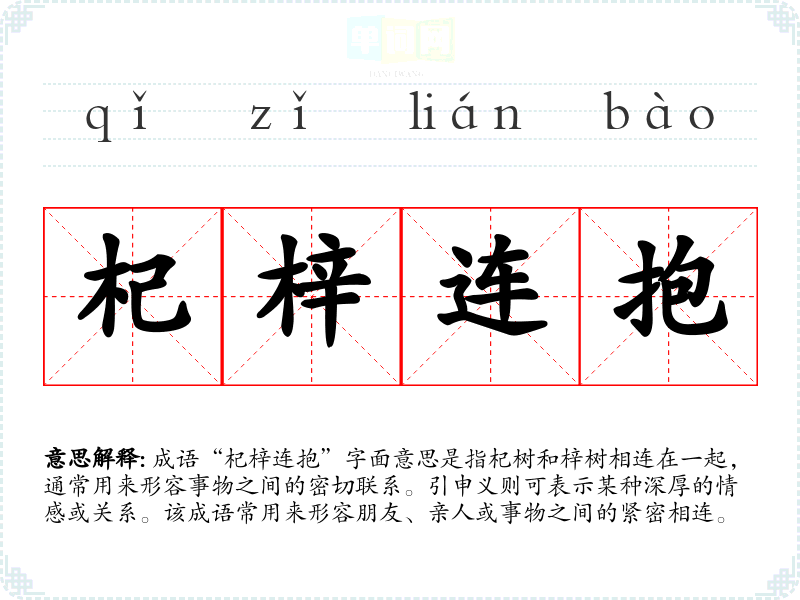 成语“杞梓连抱”字面意思是指杞树和梓树相连在一起,通常用来形容事物之间的密切联系。引申义则可表示某种深厚的情感或关系。该成语常用来形容朋友、亲人或事物之间的紧密相连。