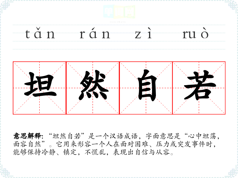 “坦然自若”是一个汉语成语,字面意思是“心中坦荡,面容自然”。它用来形容一个人在面对困难、压力或突发**时,能够保持冷静、镇定,不慌乱,表现出自信与从容。