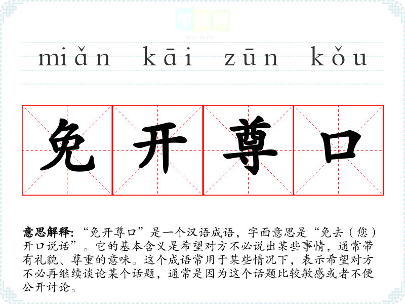 “免开尊口”是一个汉语成语,字面意思是“免去(您)开口说话”。它的基本含义是希望对方不必说出某些事情,通常带有礼貌、尊重的意味。这个成语常用于某些情况下,表示希望对方不必再继续谈论某个话题,通常是因为这个话题比较敏感或者不便公开讨论。