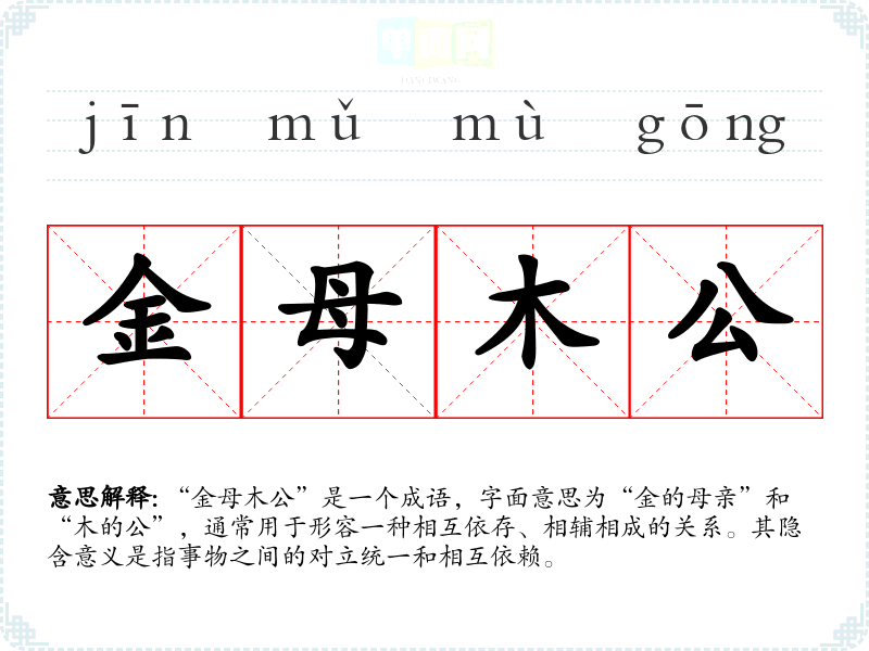 “金母木公”是一个成语,字面意思为“金的母亲”和“木的公”,通常用于形容一种相互依存、相辅相成的关系。其隐含意义是指事物之间的对立统一和相互依赖。