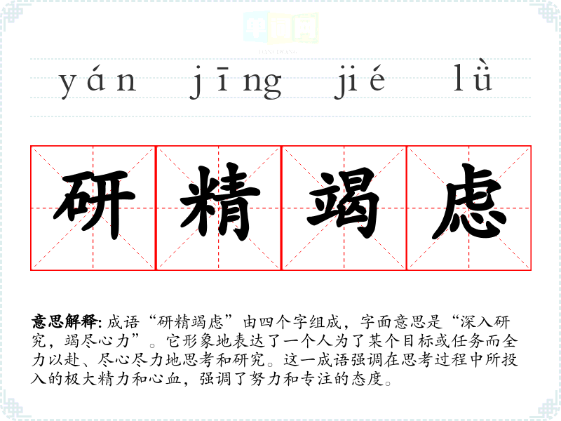 成语“研精竭虑”由四个字组成,字面意思是“深入研究,竭尽心力”。它形象地表达了一个人为了某个目标或任务而全力以赴、尽心尽力地思考和研究。这一成语强调在思考过程中所投入的极大精力和心血,强调了努力和专注的态度。