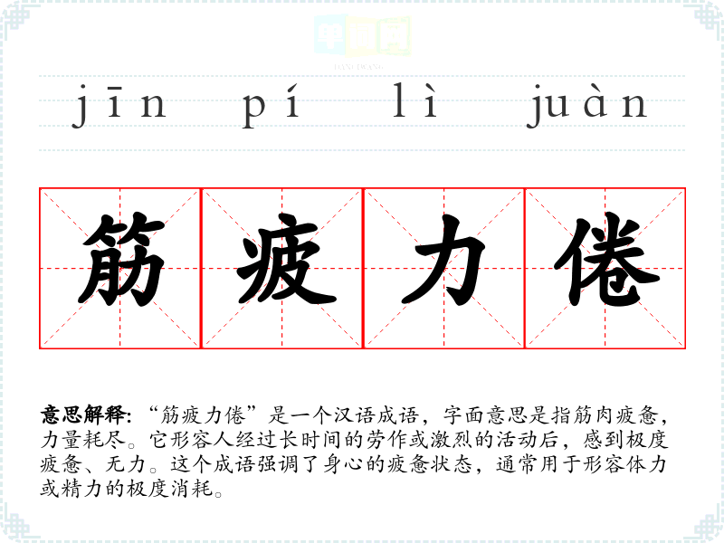 “筋疲力倦”是一个汉语成语,字面意思是指筋肉疲惫,力量耗尽。它形容人经过长时间的劳作或激烈的活动后,感到极度疲惫、无力。这个成语强调了身心的疲惫状态,通常用于形容体力或精力的极度消耗。