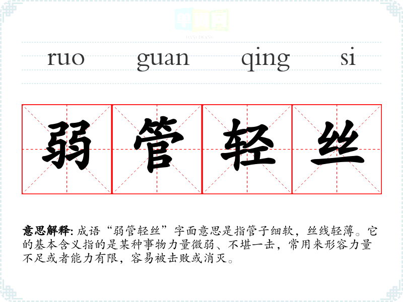 成语“弱管轻丝”字面意思是指管子细软,丝线轻*。它的基本含义指的是某种事物力量微弱、不堪一击,常用来形容力量不足或者能力有限,容易被击败或消灭。
