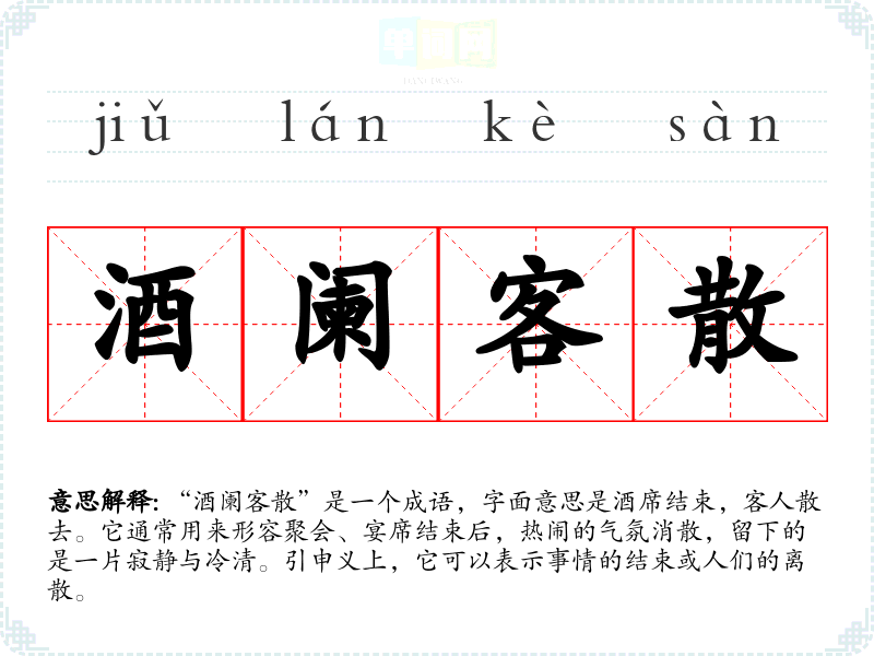 “酒阑客散”是一个成语,字面意思是酒席结束,客人散去。它通常用来形容聚会、宴席结束后,热闹的气氛消散,留下的是一片寂静与冷清。引申义上,它可以表示事情的结束或人们的离散。