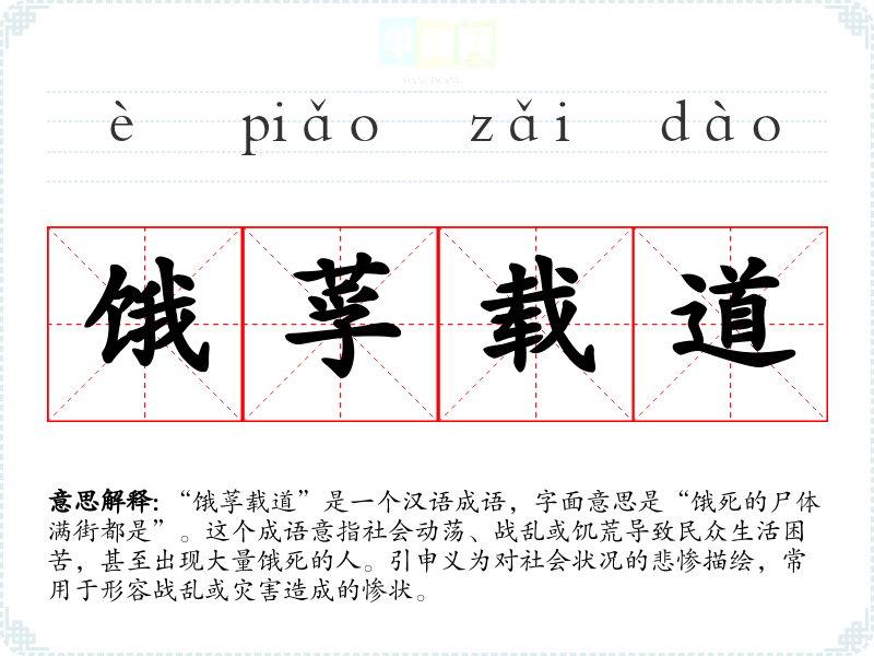 | 饿殍满道 | 殍:饿死的人。满路都是因饥饿而死的人的尸体。形容饥荒灾祸严重,人民大量死于饥寒的惨状。 |