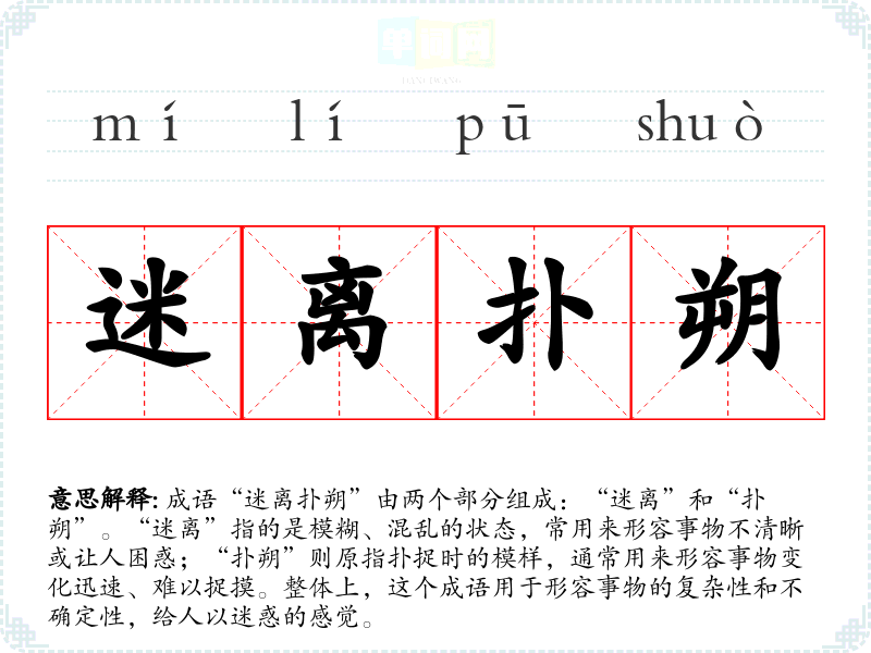成语“迷离扑朔”由两个部分组成:“迷离”和“扑朔”。“迷离”指的是模糊、混乱的状态,常用来形容事物不清晰或让人困惑;“扑朔”则原指扑捉时的模样,通常用来形容事物变化迅速、难以捉摸。整体上,这个成语用于形容事物的复杂性和不确定性,给人以迷惑的感觉。