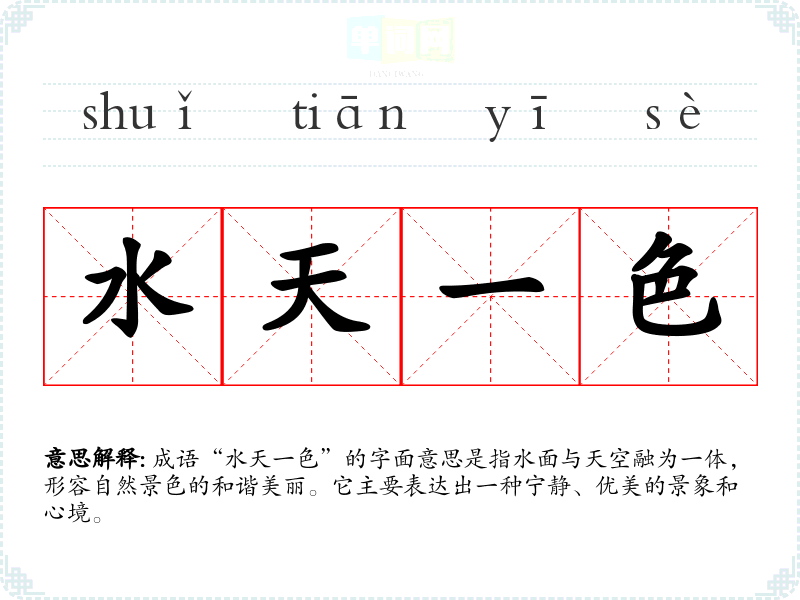 成语“水天一色”的字面意思是指水面与天空融为一体,形容自然景色的和谐美丽。它主要表达出一种宁静、优美的景象和心境。