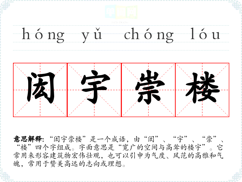 “闳宇崇楼”是一个成语,由“闳”、“宇”、“崇”、“楼”四个字组成。字面意思是“宽广的空间与高耸的楼宇”。它常用来形容建筑物宏伟壮观,也可以引申为气度、风范的高雅和气魄,常用于赞美高远的志向或理想。