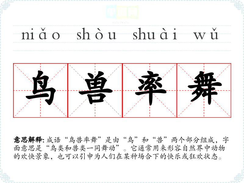 成语“鸟兽率舞”是由“鸟”和“兽”两个部分组成,字面意思是“鸟类和兽类一同舞动”。它通常用来形容自然界中动物的欢快景象,也可以引申为人们在某种场合下的快乐或狂欢状态。
