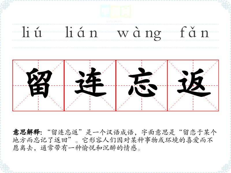 “留连忘返”是一个汉语成语,字面意思是“留恋于某个地方而忘记了返回”。它形容人们因对某种事物或环境的喜爱而不愿离去,通常带有一种愉悦和沉醉的情感。