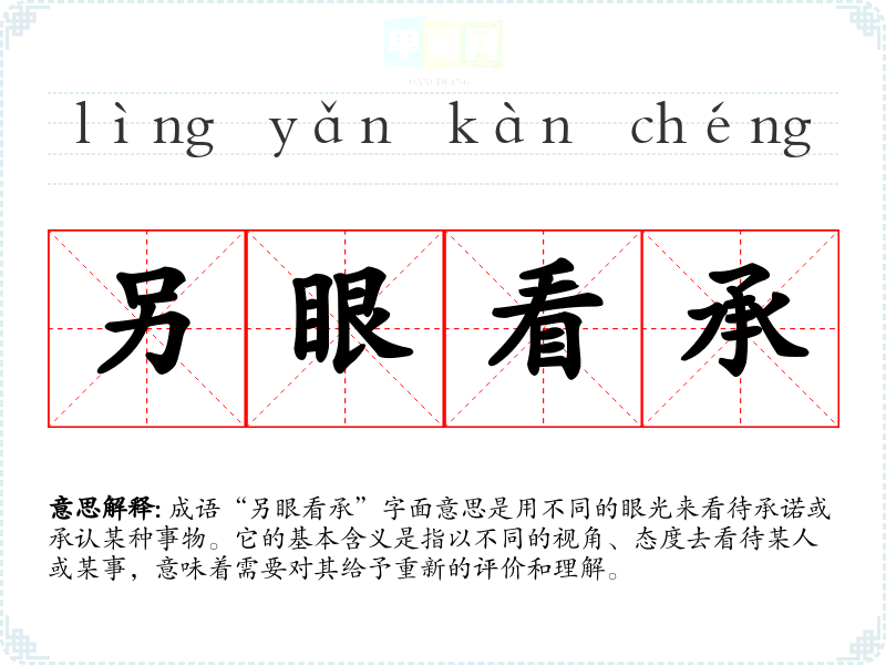 成语“另眼看承”字面意思是用不同的眼光来看待承诺或承认某种事物。它的基本含义是指以不同的视角、态度去看待某人或某事,意味着需要对其给予重新的评价和理解。